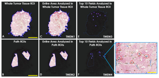 The 10 highest TMEM doorway scoring high power fields were identified using an automatic ranking mechanism as previously published [5,10]. Briefly, the MicroImager module in Vis divided the entire area of Whole Tumor Tissue or the Path ROIs into subfields of equal area with each subfield equivalent to a pathologist’s microscope high-power field (330 × 440 µm2 each, Figure 2G). Next, TMEM doorways were quantified in all of the high-power fields and the 10 fields with the highest number of TMEM doorways were identified and the sum of TMEM doorways in these fields was used as the TMEM Score for the patient sample (Top 10 TMEM Score) [5].