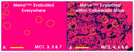 We evaluated MenaCalc using the same approaches described above. In addition, in the original MenaCalc publications [21,22], quantification of Mena signals was limited to a binary “tumor mask” representing only epithelial cells and excluding stromal features. To determine if this signal was indeed important for the performance of the marker, we additionally varied whether the MenaCalc was measured within the entire image (Figure 3A, pink area), or just within the area determined by a thresholded cytokeratin signal mask (Figure 3B, pink area). As a result, eight different variations of MenaCalc were evaluated, named MC1 through MC8 (Table 1).