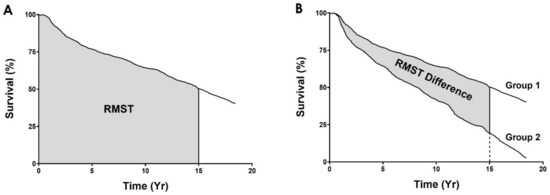Graphic representation of restricted mean survival time and its difference. (A) RMST is the integration of survival probability across a pre-specified time, which graphically is the area under the survival curve. (B) RMST difference represents the group separation of the survival analysis.