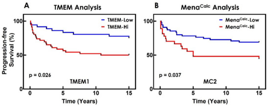 Progression-free survival curves for TMEM doorway and MenaCalc analyses. Distant metastasis of breast tumor was used as the endpoint in this study. (A) Kaplan–Meier curve for the TMEM doorway analysis in Whole-Tumor Tissue ROI, Entire Area (TMEM cut-off point = 5.16). (B) Kaplan–Meier curve for the MenaCalc analysis in Whole-Tumor Tissue ROI, Entire Area, with Cytokeratin Mask (MenaCalc cut-off point = 0.02).