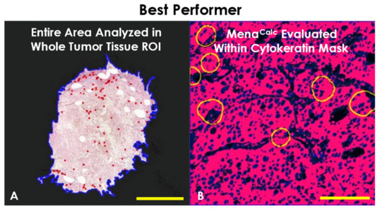 Performing Combined Marker analysis. The Combined Marker analysis which showed the highest performance gain over both TMEM doorway and MenaCalc alone was the one evaluated in the entire area of the Whole-Tumor Tissue ROI (A) and utilized cytokeratin mask in the MenaCalc evaluation (B). TMEM doorways were circled in yellow. Scale bar in (A) = 5 mm. Scale bar in (B) = 100 µm.