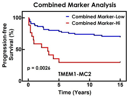 Progression-free survival curves for best-performing Combined Marker. Distant metastasis of breast tumor was used as the endpoint in this study. Kaplan–Meier curve for the best performing Combined Marker analysis (TMEM cut-off point = 5.16, MenaCalc cut-off point = 0.02).