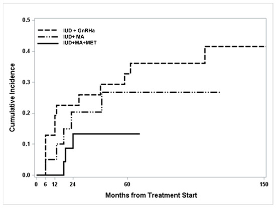 A global increase in relapse CI was found over time and was more frequently detected in patients treated with GnRHa + LNG-IUD, when compared to women treated with MA + LNG-IUD or MA + LNG-IUD + MET, but not significantly (p = 0.21) (Figure 1).