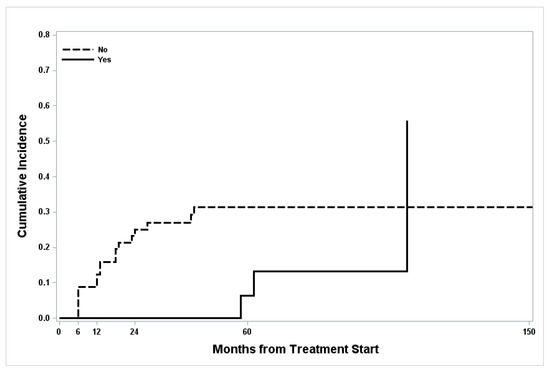 Cumulative incidence curves for relapse according to treatment.