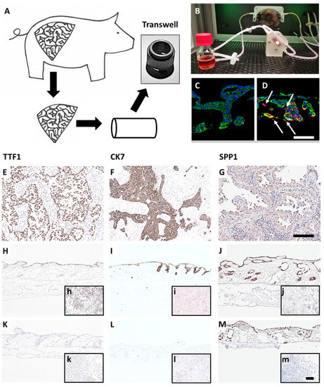 A preclinical tissue tumor model reflecting EMT, invasion, clinical and biological markers. (A) 3D tumor model based on porcine jejunum. (B) Dynamic cell culture in a flow bioreactor. (C) HCC827 lung cancer cells on SISmuc (Pan-cytokeratin, green) and (D) HCC827 cells on SISmuc + TGF-β1 in a flow bioreactor, arrows: vimentin-positive cells (red) invading across the basement membrane the collagen matrix. DAB staining of TTF1, CK7, and SPP1 on paraffin sections: adenocarcinoma of the lung (E–G), HCC827 cells on SISmuc under static culture conditions (H–J), inserts: HCC827 in 2D, A549 cells on SISmuc under static culture conditions (K–M), inserts: A549 in 2D. Scale bar in (D,G) = 100 µm for (C–M); scale bar in m = 100 µm for (h–m).
