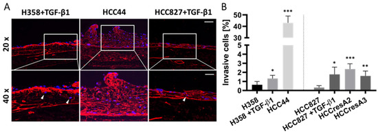EMT correlates to some extent with invasion, but the intrinsic invasion of HCC44 exceeds TGF-β1-induced invasion in H358 and HCC827. (A) Collagen IV (red) immunofluorescence staining with DAPI (blue) counterstaining of HCC44 tumor models or H358 and HCC827 3D models treated with 2 ng/mL TGF-β1. Invasive cells are indicated with white arrowheads. HCC827 gefitinib-resistant subclones A2 and A3 display a similar degree of invasion as parental HCC827 stimulated with TGF-β1. Scale bar = 100 µm (upper panel); 50 µm (lower panel); n = 4. (B) Quantitative evaluation of invasive cells; n = 4. Significance determined with unpaired t-tests versus H358 or HCC827, respectively. *: p ≤ 0.05, **: p ≤ 0.01, ***: p ≤ 0.001.