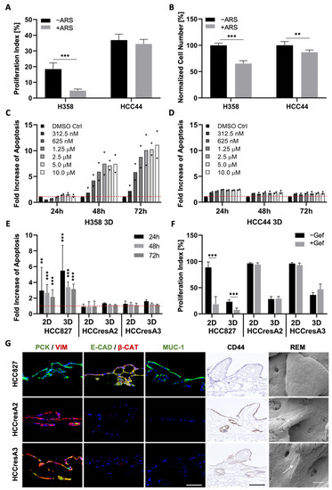 Next, we investigated how EMT correlates with drug response in our three cell lines carrying the clinically relevant KRASG12C (H358, HCC44) and EGFR mutation (HCC827). Since tumors with KRAS mutations exhibit a high chemoresistance, termed primary resistance, we selected H358 and HCC44 cells as they both harbor the KRASG12C mutation. This mutated protein is targetable with the allele-specific and covalent inhibitor ARS-1620, a derivative of which received accelerated approval by the FDA in May 2021. Our analysis shows a strong connection between EMT and drug response in both 2D and 3D cell cultures (Figure 4 and Figure S2). After low doses of ARS-1620, the more epithelial H358 cells show a reduction in cell number as well as in proliferation and dose-dependent apoptosis induction (Figure 4A–C). In the more mesenchymal and invasive HCC44 cells, no pronounced and dose-dependent effects on cell number, proliferation, and apoptosis could be observed (Figure 4A,B,D). Regarding the EGFR mutation, in the resistant subclones HCCresA2 and HCCresA3 permanently treated with the EGFR inhibitor, resistance correlates with EMT (PCK/VIM), loss of E-cadherin, downregulation of Mucin-1 and upregulation of CD44 (Figure 4E–G).