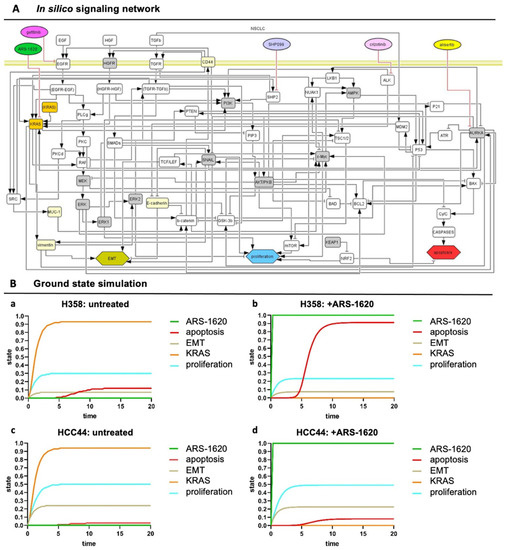In silico signaling network topology used for H358 and HCC44 therapy simulations. (A) The network of protein–protein interactions (rounded rectangles) and cellular responses (hexagons) integrates common co-mutations of KRAS. Interactions: arrows activating interactions, blunted arrows inhibitory interactions; white rectangles: interacting nodes, gray rectangles: assumed to be constant, yellow rectangles: constant nodes tested experimentally, orange rectangles: KRASmt node. (All coding also applies to the following simulations) (B) SQUAD calculates the activity changes and responses for every node in the network in detail. H358 and HCC44 treated with ARS-1620, with H358 being a responder to KRAS inhibition seen by induction of apoptosis and slight reduction in proliferation, which is not the case in simulations for HCC44 cells. (a) Untreated H358, (b) H358 treated with ARS-1620, (c) untreated HCC44, and (d) HCC44 treated with ARS-1620. Only the readout of interesting nodes of our network is shown. However, all nodes of the network as given in (A) are simulated and available in their trajectories so that novel drugs, as well as the detailed response of the whole network, can be studied.