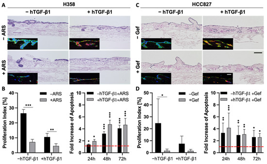 As described above, the stimulation of H358 and HCC827 cells with TGF-β1 resulted in a progressed EMT phenotype, pointed out by a lower expression of epithelial markers and a stronger expression of mesenchymal markers (Figure 2 and Figure 6A,C). Both H&E and immunofluorescence stainings indicated reduced cell numbers in H358 and HCC827 tumor models after treatment with either ARS-1620 or gefitinib, independent of TGF-β1 (Figure 6A,C). While treatment with TGF-β1 alone already resulted in reduced proliferation indices for both cell lines compared to the untreated controls, additional treatment of the H358 and HCC827 cells with ARS-1620 or gefitinib, respectively, led to an even stronger decline in the proliferation rate (Figure 6B,D). The increase in apoptosis in cultures treated with both TGF-β1 and ARS-1620 or gefitinib was comparable to that in cultures solely treated with the corresponding targeted therapy (Figure 6B,D). In summary, the tissue architecture, the reduced proliferation indices, as well as the increase in apoptosis provide evidence that EMT induction with TGF-β1 alone is not sufficient to mediate resistance of H358 and HCC827 cells toward either ARS-1620 or gefitinib.