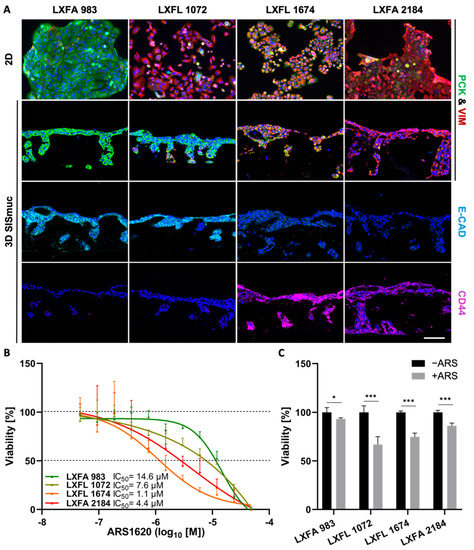 Neither EMT status nor CD44 expression correlates in PDX cell lines with drug response in 2D and 3D. (A) Pan-cytokeratin (PCK, green), vimentin (VIM, red), E-cadherin (light blue), and CD44 (purple) immunofluorescence staining of KRASG12C-mutated PDX-derived lung cancer cells in 2D (n = 2) and 3D (n = 2). Scale bar = 100 µm. (B) CellTiter-Glo viability assay of PDX-derived lung cancer cells after treatment with increasing concentrations of ARS-1620. Calculated IC50 values for 2D cultures are indicated. The picture shows the IC50 curve of one representative experiment of two independent assays; n = 2. (C) MTT-assay of 3D SISmuc tumor models seeded with the PDX-derived cell lines and treated with 1 µM ARS-1620 for 72 h. Significance determined with unpaired t-tests. *: p ≤ 0.05, ***: p ≤ 0.001; n = 4.
