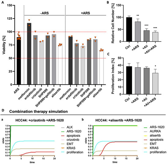 Combination of ARS1620 with AURKA inhibitor alisertib as the most effective combination in 3D HCC44 tumor models. (A) MTT assays of HCC44 tumor models treated with 1 mM metformin or 5 µM SHP099, erdafitinib, gefitinib, crizotinib, or alisertib. Drugs were tested either in monotherapies or in combination with 1 µM ARS-1620. Triangles (▼) represent values from single biological replicates; n ≥ 2. (B) Relative cell numbers and (C) proliferation indices of HCC44 cells in 3D after the treatment for 72 h with 1 µM ARS-1620, 5 µM alisertib and the combination of both inhibitors; n = 4. (D) In silico combination therapy simulations of (a) HCC44 treated with crizotinib and ARS-1620 and (b) HCC44 treated with alisertib and ARS-1620. Color code for different readout parameters is given on the right side of the figure. Significance determined with unpaired t-tests. *: p ≤ 0.05, **: p ≤ 0.01, ***: p ≤ 0.001.