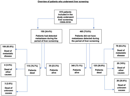 Overview of 615 patients who underwent liver screening according to the detection of metastases, outcome and cause of death.