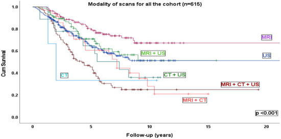 Kaplan–Meier survival curve and table where all the patients were stratified according to modality of scan performed. MRI: 137 patients underwent 983 scans; CT: 3 patients underwent 7 scans; US: 239 patients underwent 515 scans; MRI + CT: 36 patients underwent 400 scans; MRI + US: 87 patients underwent 644 scans; CT + US: 18 patients underwent 84 scans. MRI + CT + US: 95 patients underwent 1223 scans. Number of events indicates the number of deaths.