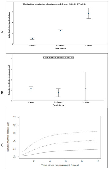 Pseudo-anonymized data were collected, filed, and processed in Excel format (Microsoft, Inc., UoL, London, UK). Categorical variables were summarized with counts and median with range and expressed as frequencies and percentages. A new model in which two predictors (outputs of LUMPO3) were considered: (1) prognostic index of death due to other causes; and (2) prognostic index of death due to metastases; was used to estimate the time of onset of metastases [30]. Statistical analysis was performed using SPSS software V27 (IBM) and checked by coauthors AFGT and AE.
