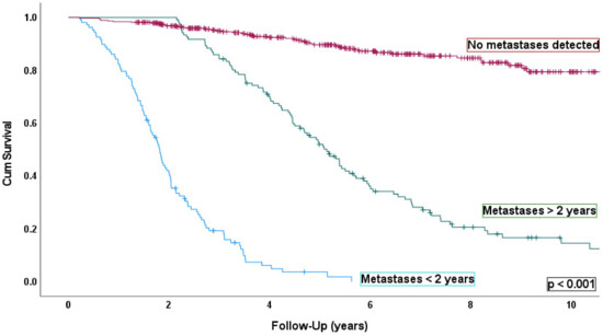 Kaplan–Meier survival curve and table where all the patients were stratified according to when and whether developed metastases; Group1—patients diagnosed with metastases < 2 years (n = 108) (p < 0.001); Group 2—patients diagnosed with metastases after 2 years (n = 121) (p < 0.001); and Group 3—patients who had not been diagnosed with metastases at study closure (n = 386) (p < 0.001). Number of events indicates the number of deaths.