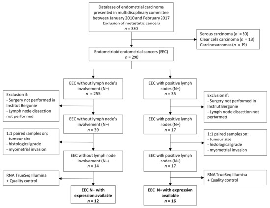In this study, the only patients who were selected were those for whom surgery was performed in Institut Bergonie, with guaranteed homogeneity in terms of surgical technique and sample processing in pathology laboratory. Our population was uniformly treated, with complete clinical data. The diagnosis of EEC and, in particular, the evaluation of histological parameters which have risk factors’ value such as myometrial invasion, histological grade and the assessment of lymphovascular space invasion are subject to interobserver variability [49,50]. Moreover, diagnostic criteria have evolved during the selection period. Currently, lymph node invasion risk is assessed pre-operatively on the basis of tumor size, histological grade and myometrial invasion. Our study population of N+ patients was matched to N− patients with the same tumoral characteristics. This method ensures the comparability of our two study groups, to prevent confusion bias. Non-endometrioid endometrial cancers were excluded from our analysis to guarantee homogeneity between the different groups and to ensure that differential expression found between the groups was exclusively due to lymph nodal metastases.