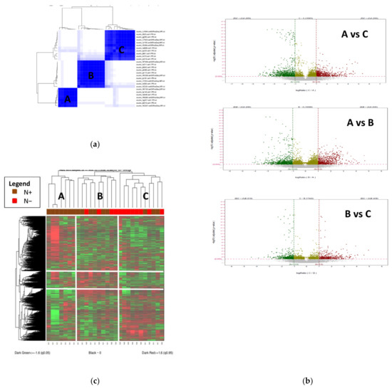 Apart from the lymph node invasion, no other histopathological characteristic was found statistically different between the three clusters (Table S2). We then performed DGE analysis between the three groups, which identified 1491 genes between A and B (Figure S3), 1416 genes between A and C (Figure S2), 956 genes between B and C (Figure S4) and 1348 genes between A and B + C (Figure S5). These results show that, once the initial N+/N− cohort has been reorganized by regrouping samples which have mixed N+/N− characteristics, as the B group, then strong gene expression differences could be identified.