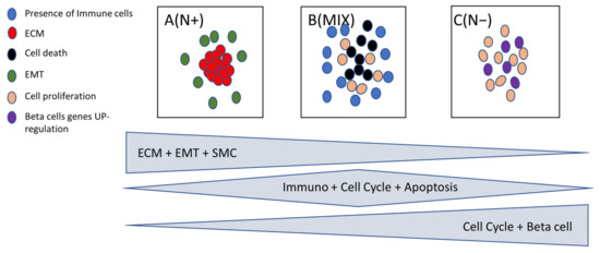 Two pathways were upregulated in cluster C (enriched in N−): the Cell Proliferation and Beta Cells pathways. Cluster B (a mix of N+ and N− samples) broadly overexpressed all Immune Cell types (See Material and Methods) as well as the Cell Death pathway (Figure 3).