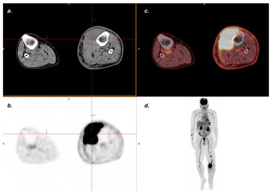 - Morooka, M.; Ito, K.; Kubota, K.; Yanagisawa, K.; Teruya, K.; Hasuo, K.; Shida, Y.; Minamimoto, R.; Kikuchi, Y.; Oka, S. Usefulness of F-18 FDG PET/CT in a Case of Kaposi Sarcoma with an Unexpected Bone Lesion. Clin. Nucl. Med. 2011, 36, 231–234. [Google Scholar] [CrossRef]