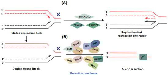 - Tye, S.; Ronson, G.E.; Morris, J.R. A fork in the road: Where homologous recombination and stalled replication fork protection part ways. Semin. Cell. Dev. Biol. 2021, 113, 14–26. [Google Scholar] [CrossRef] [PubMed]