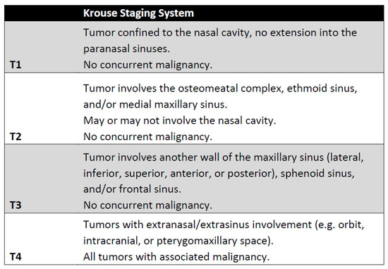 32. Nakayama, T.; Tsunemi, Y.; Kashiwagi, T.; Kuboki, A.; Yamakawa, S.; Konno, W.; Mori, A.; Iimura, J.; Tsukidate, T.; Tanaka, Y.; et al. Comparison of Current Staging Systems for Sinonasal Inverted Papilloma. Am. J. Rhinol. Allergy 2021, 35, 64–71. [Google Scholar] [CrossRef] [PubMed]