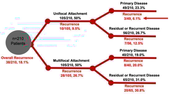 Figure 8. IP outcomes stratified by attachment (unifocal vs. multifocal), primary or residual/recurrent disease by a single institution. Red arrow denotes optimal outcome after management of unifocal primary disease.