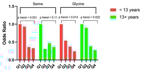In stratified analysis by median follow-up time (i.e., <13 versus ≥13 years), the significant inverse trends for serine and glycine with risk of pancreatic cancer were present for both shorter and longer periods of follow-up. Accordingly, the ORs (95% CIs) for the highest relative to the lowest quartiles of serine and glycine were 0.33 (0.09–1.26) and 0.24 (0.07–0.78), respectively, in participants with less than 13 years of follow-up (both ptrend < 0.05). The corresponding figures in participants with 13 or more years of follow-up were 0.36 (0.11–1.14, ptrend = 0.11) and 0.27 (0.07–1.00, ptrend = 0.02), respectively (Figure 2).