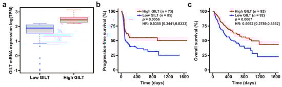 To investigate the clinical significance of GILT expression in metastatic melanoma specimens in response to ICI, we determined the association of GILT mRNA expression with overall survival in the combined cohort of patients from the Liu, Van Allen, and Hugo datasets. The association of GILT mRNA expression with progression-free survival was assessed in the combined Liu and Van Allen datasets, since progression-free survival was not available for the Hugo dataset. A range of GILT mRNA expression was observed in melanoma patients from the Liu, Van Allen, and Hugo datasets (Figure 1a), as previously reported in other melanoma patient cohorts []. As stage is a prognostic factor for survival, stage was included as a covariate in the survival analysis. The association of GILT with progression-free survival and overall survival remained statistically significant after adjusting for stage, and thus, the effect of GILT is independent of stage. Patients in the Liu and Hugo datasets were treated with anti-PD-1, and patients in the Van Allen dataset were treated with anti-CTLA-4 (Table 1). To adjust for the effect of dataset, which includes differences in therapy, dataset was included as a covariate in the survival analysis. The final multivariate model, including categorical GILT expression, stage, and dataset, demonstrated a significant association of high GILT mRNA expression with improved progression-free and overall survival in patients treated with ICI (Figure 1b,c). Median progression-free survival in the Liu and Van Allen datasets was 120 days for the low GILT expression group and not reached for the high GILT expression group. The median overall survival for the combined Liu, Van Allen, and Hugo datasets was 521 and 980 days for the low and high GILT expression groups, respectively. A sensitivity analysis, where GILT expression was divided into four quartiles, suggested that quartiles one and two had similar survival, which significantly differed from the survival for quartiles three and four (data not shown). These data demonstrate an association of high GILT mRNA expression with improved survival in metastatic melanoma patients treated with ICI.