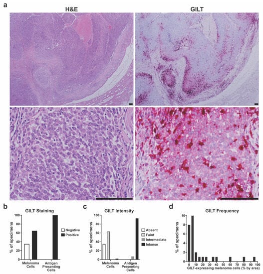 Variable GILT protein expression in melanoma cells of metastatic tumor specimens. (a) Representative hematoxylin and eosin (H&E) staining (left panels) and GILT immunohistochemical (IHC) staining of serial sections of metastatic melanoma specimens. Lower magnification (top panels) illustrates GILT staining in a subset of melanoma cells. Higher magnification (bottom panels) illustrates faint GILT staining within melanoma cells and intense GILT staining within antigen presenting cells with a dendritic morphology. Bar = 100 µm. (b) Percentage of metastatic melanoma specimens with negative or positive GILT staining in melanoma cells and antigen presenting cells. (c) Intensity of GILT staining within melanoma cells and antigen presenting cells in metastatic melanoma specimens. (d) Distribution of GILT-expressing melanoma cells within the n = 28 specimens with positive GILT staining in melanoma cells.