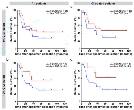 To investigate the clinical significance of GILT protein expression in metastatic melanoma cells, the association of GILT protein expression with overall survival was determined for all of the patients in the clinical dataset and in the subset of patients in the clinical dataset treated with ICI. In examining all of the patients in the clinical dataset, high GILT protein expression was associated with a longer overall survival (Cox proportional hazards model, p = 0.1270; HR [95% CI] = 0.7139 [0.4630, 1.1010]) adjusted for stage, age, and sex; however, it did not reach statistical significance. To visualize these data, Kaplan–Meier plots of the patients in the clinical dataset were separated into high or low GILT protein expression groups, using cutoffs of 1% (same groupings as median) and 10% of the melanoma cells expressing GILT (Figure 3a,b) were generated. Using the 1% cutoff, the low and high GILT expression groups had a median survival of 26 months and 36 months, respectively (Figure 3a). With a 10% cutoff, the median survival was 20 months in the low GILT expression group and was not reached in the high GILT expression group (Figure 3b).