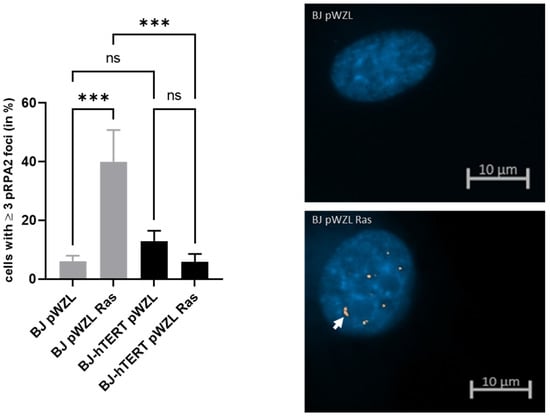 Evaluation of pRPA2 foci formation upon oncogene-induced replication stress. (Left) The bar plot displays the impact of ectopic H-RASG12V on pRPA2 foci formation in BJ and BJ-hTERT cells. pWZL represents the empty vector control. One-way ANOVA test was applied, followed by a Fisher’s LSD post hoc test, with a confidence interval of 95%. (Right) Representative images of BJ-pWZL (top) and BJ pWZL-RASG12V (bottom) are shown. A total of 210 cells were counted from n = 6 independent experiments. The representative pictures show DAPI-stained nuclei with nuclear pRPA2 foci (white arrow). ns (p > 0.05), *** (p ≤ 0.001).