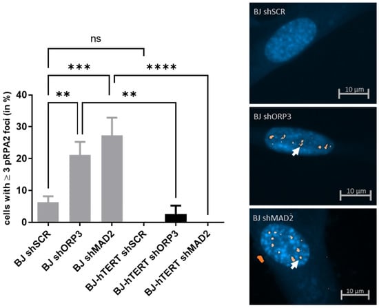 In line with our previous data, these results show that the KD of ORP3 and MAD2 induces replication stress in telomerase-negative human fibroblast BJ, and that the replication stress can be detected with pRPA2.