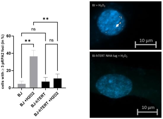 Evaluation of pRPA2 foci formation upon ROS-induced replication stress. (Left) The bar plot displays the impact of H2O2 treatment on pRPA2 foci formation in BJ and BJ-hTERT cells. One-way ANOVA test was applied, followed by a Fisher’s LSD post hoc test, with a confidence interval of 95%. (Right) Representative images from BJ (top) and BJ-hTERT (bottom) treated with H2O2. A total of 180 cells were counted from n = 3 independent experiments. The representative pictures show DAPI-stained nuclei with nuclear pRPA2 foci (white arrow). ns (p > 0.05), ** (p ≤ 0.01).