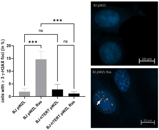 The overexpression of RASG12V increases the level of γ-H2AX foci in BJ cells as compared to the control cells (BJ-PWZL) about 8-fold (~1.9% versus ~14.66%; p = 0.0007) (Figure 4). This points out that the replication stress induced by oncogene overexpression can be readily detected by γ-H2AX. More importantly, the determination of OI-RS by γ-H2AX provides a better marker compared to pRPA2; the replication stress is clearer and does not exhibit as much background as with pRPA2. The replication stress increase detected by γ-H2AX was 8-fold (~1.9% versus ~14.66%) as compared to the 6.5-fold increase by pRPA2. The reduction from BJ-RAS to BJ-hTERT-RAS is also clearer in the evaluation with γ-H2AX. Telomerase activity reduces the replication stress by ~12.3% via γ-H2AX evaluation, but only by ~6.8% in the evaluation via pRPA2.