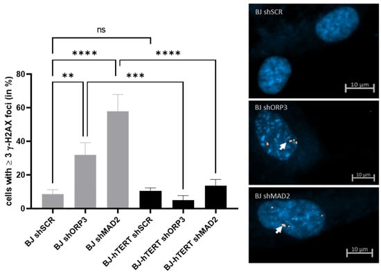 In BJ-hTERT, γ-H2AX foci formation is significantly suppressed upon ORP3 or MAD2 KD as compared to their KD in BJ cells (Figure 5). The KD of ORP3 induced 6-fold less γ-H2AX foci in BJ-hTERT as compared to BJ cells (~5% versus ~32%; p = 0.0004), and the KD of MAD2 induced 4-fold less γ-H2AX foci (~13.7% versus ~57.9%; p < 0.0001).