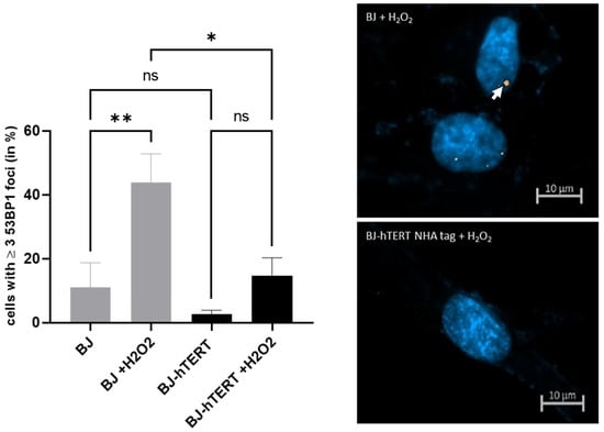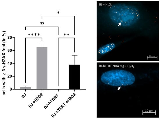 We observed a nearly 19-fold increase in γ-H2AX foci formation in BJ cells upon H2O2 treatment (~3.3% versus ~65%; p < 0.0001), indicating that these cells strongly suffer from DNA damage under the treatment conditions (Figure 6). Moreover, we observed a significant but faint suppression of γ-H2AX foci formation in the presence of telomerase upon H2O2 treatment (p = 0.0118), indicating that this molecular marker is less suitable for the evaluation of the impact of telomerase in the context of ROS-induced RS (Figure 6). In fact, a significant amount of the H2O2-treated BJ-hTERT cells exhibited ≥3 γ-H2AX foci, while untreated BJ-hTERT cells were completely negative for this marker (~38.1% versus 0%; p = 0.0014).