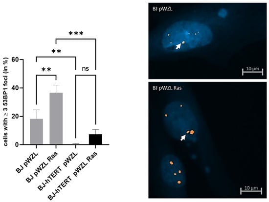 The expression of RASG12V in BJ cells increases the proportion of cells displaying ≥3 53BP1 foci as compared to BJ-pWZL with only a 2-fold increase (~18.2% versus 36.6%) (Figure 7). However, this difference is less significant (p = 0.0083), likely due to background 53BP1 signals in a high proportion of BJ-PWZL cells (about 20%). Based on this data, 53BP1 is less suitable for the evaluation of OI-RS. Interestingly, however, we found that the proportion of cells with 53BP1 signals is reduced in the presence of telomerase in the context of OI-RS (~36.6% in BJ-RASG12V compared to ~7.3% in BJ-hTERT-RASG12V; p = 0.0002).