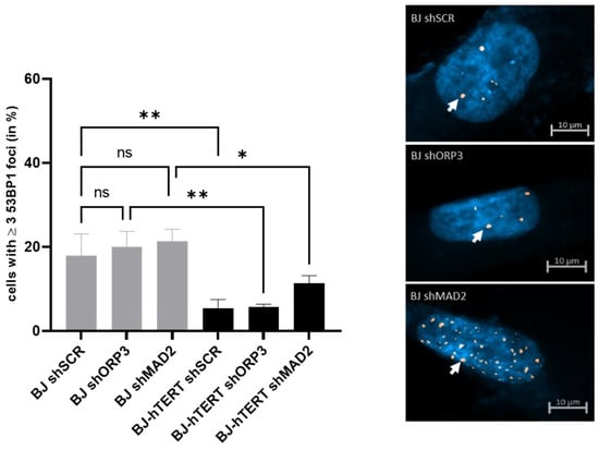 Interestingly, telomerase activity reduces the proportion of cells displaying ≥3 53BP1 foci upon ORP3 KD (~20.04% versus ~5.6%; p = 0.0023) and upon MAD2 KD (~21.4% versus ~11.3%; p = 0.0270) (Figure 8). This points out that even though the increase in BJ cells upon aneuploidy induction is not significant, the abrogation upon the introduction of telomerase is still significant.