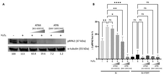Inhibition of ATM or ATR impairs ROS-induced replication stress in BJ cells. BJ and BJ-hTERT cells were subjected to the inhibitors KU-60019, an ATM kinase inhibitor (1–3 µM), and BAY-1895344, an ATR inhibitor (5–25 nM) for 1 h, before the addition of 400µM H2O2 for another hour. (A) A representative Western Blot showing the decrease of pRPA2 levels upon treatment with ATM and ATR inhibitors in BJ cells. As a loading control, α-tubulin is shown. Intensity ratios of the pRPA2 lower band normalized to α-tubulin, and relative to BJ cells without treatment, are indicated below the blot (in %). (B) The bar plot evaluates the impact of H 2O2 on pRPA2 foci formation after ATM and ATR inhibition in BJ and BJ-hTERT cells. One-way ANOVA test was applied, followed by a Fisher’s LSD post hoc test, with a confidence interval of 95%. A total of 310 cells were counted from n = 2 independent experiments. ns (p > 0.05), * (p ≤ 0.05), ** (p ≤ 0.01), **** (p ≤ 0.0001).