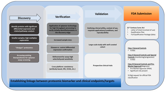 Aptamer-based platforms embody the beginning stages of the traditional biomarker discovery pipeline (discovery, verification, and validation), sharing a position with mass spectrometry [138] (Figure 2). One of the common challenges in proteomic biomarker discovery is the poor translation into the clinic, with an extensive track record of biomarkers fizzling out during FDA approval [139]. While the high multiplexing capability of aptamers broadens the survey of the human proteome, the sheer number of proteins and their varying abundances make detecting disease-specific variations a challenging feat. As aptamer assays continue to broaden over time, a more encompassing picture may be drawn at the cost of higher false discovery rates. With the arduous task of achieving FDA approval [140], false discovery rates of inaccurate biomarkers come at a high cost. While adequately designed statistical analysis and sufficiently powered studies may address this, single protein-based biomarkers will merit a considerable effort to achieve approval. Multi-marker panels serve as a more robust substitute [141,142]. Two significant advances in proteomic biomarker discovery in the last decade have been the FDA approval of the OVA1 [143] and CKD273 [144] panels. The CKD273 panel was based upon capillary electrophoresis coupled to mass spectrometry (CE–MS) technology, which supports the throughput of thousands of peptides that strongly supported earlier stages of research [145]. Building large, comparative datasets that feature large sample sizes can greatly support discovery-stage proteomics. The high precision, throughput, and multiplex aspects of aptamers facilitate this goal. It is paramount for studies to consider analytical factors for effective translational hypothesis generation to follow. Current ambitions for blood-based diagnostics and liquid biopsies in cancer [146] will continue to fuel a strong interest in aptamer-identified biomarkers. Clinical translation, however, will depend on the ability to transfer findings between the clinic and bench research, which will require that subsets of large-scale aptamer-based data panels be transferrable between species to allow for findings to be replicated in laboratory animals and human samples to advance outcomes predicated on alteration in management.