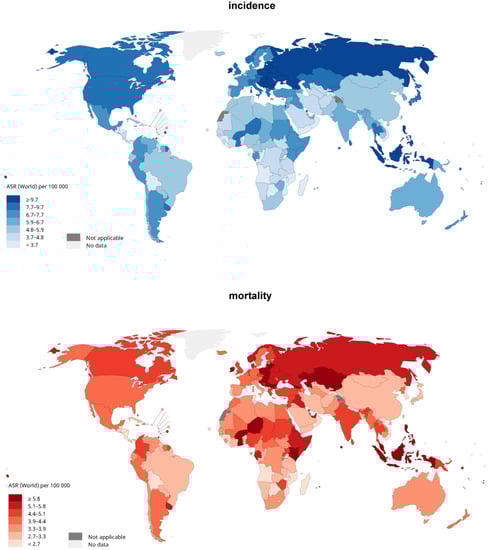 - Bray, F.; Colombet, M.; Mery, L.; Piñeros, M.; Znaor, A.; Zanetti, R.; Ferlay, J. Cancer Incidence in Five Continents, Vol. XI (Electronic Version) Lyon: International Agency for Research on Cancer. 2020. Available online: https://ci5.iarc.fr (accessed on 10 May 2020).