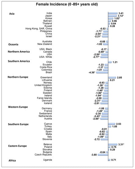 - Engholm, G.; Ferlay, J.; Christensen, N.; Bray, F.; Gjerstorff, M.L.; Klint, A.; Kotlum, J.E.; Olafsdottir, E.; Pukkala, E.; Storm, H.H. NORDCAN—A Nordic tool for cancer information, planning, quality control and research. Acta. Oncol. 2010, 49, 725–736. [Google Scholar] [CrossRef]