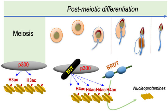 - Shiota, H.; Barral, S.; Buchou, T.; Tan, M.; Couté, Y.; Charbonnier, G.; Reynoird, N.; Boussouar, F.; Gérard, M.; Zhu, M.; et al. Nut Directs P300-Dependent, Genome-Wide H4 Hyperacetylation in Male Germ Cells. Cell Rep. 2018, 24, 3477–3487.e6. [Google Scholar] [CrossRef] [Green Version]