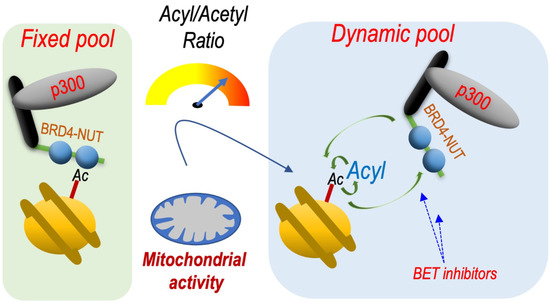 Finally, using the context of B Acute Lymphoblastic Leukaemia (B-ALL), it has recently been demonstrated that the metabolism-driven H4K5 acetylation/acylation ratio is able to tune the stability of the binding of BRD4 with chromatin [26]. These data showed that a metabolic activity that favours histone H4K5 butyrylation and crotonylation over acetylation increases BRD4 dynamics and sensitivity to the BET inhibitor JQ1. By using a BRD4-NUT expressing cell model, it was indeed possible to directly show that an increase in the butyrylation-crotonylation/acetylation ratio increases the motility and dynamics of BRD4-NUT chromatin binding.