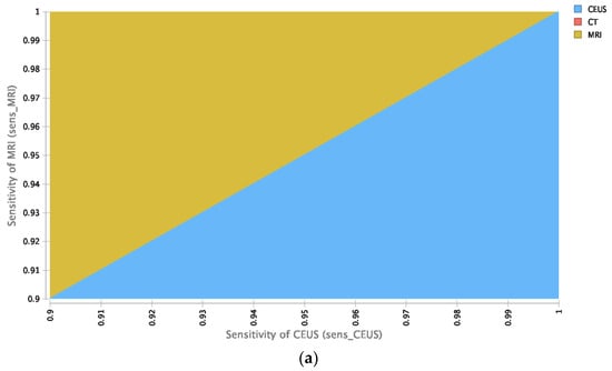 MRI sensitivity and specificity were defined to be 90% and 96%, and CT sensitivity and specificity were defined to be 75% and 72% based on comparative research work [29]. CEUS sensitivity and specificity were defined to be 99.10% and 80.50% [17].
