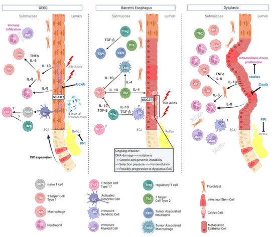 Immunologic networks in the progression of Esophagitis over Barrett’s esophagus to Dysplasia. Overall, the phenotype changes from type 1 domination in esophagitis (GERD) to type 2 in Barret’s Esophagus and back to type 1 in Dysplasia. Tregs may be initially protective through inhibition of tumorigenic Th17 cells. Th2 cells support metaplasia via IL-4, which induces goblet cell associated MUC2. Gray arrows indicate migration and question marks indicate unclear roles, as elaborated in the main text. Abbreviations: Coxib = Cyclooxygenase Inhibitor; IL = Interleukin; ISC = Intestinal Stem Cell; PPI = Proton Pump Inhibitor; SCJ = Squamo-Columnar Junction; TGF-β = Transforming Growth Factor β; TNFα = Tumor Necrosis Factor α. Generated with biorender.com.
