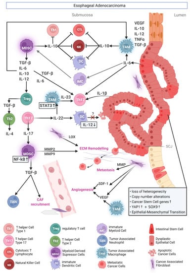 Tumor Microenvironment in Esophageal Adenocarcinoma. Redundant processes suppress central events in anti-tumor immunity, such as CTL and NK cell activity and associated Th1 activation, or DC maturation. Abbreviations: CAF = Cancer Associated Fibroblast; ECM = Extracellular Matrix; IL = Interleukin; LOX = Lysyl Oxidase; PPI = Proton Pump Inhibitor; SCJ = Squamo-Columnar Junction; SDF-1 = Stromal Cell Derived Factor 1; TGF-β = Transforming Growth Factor β; SOX9 = SRY-Box Transcription Factor 9; TNFα = Tumor Necrosis Factor α; VEGF = Vascular Endothelial Growth Factor; MMP = Matrix Metalloproteinase; and YAP1 = yes-associated protein 1. Generated with biorender.com.