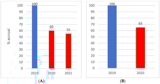 Impact on clinical trial accrual 2019–2021. (A) Clinical trial accrual January to June; (B) clinical trial accrual January to December.