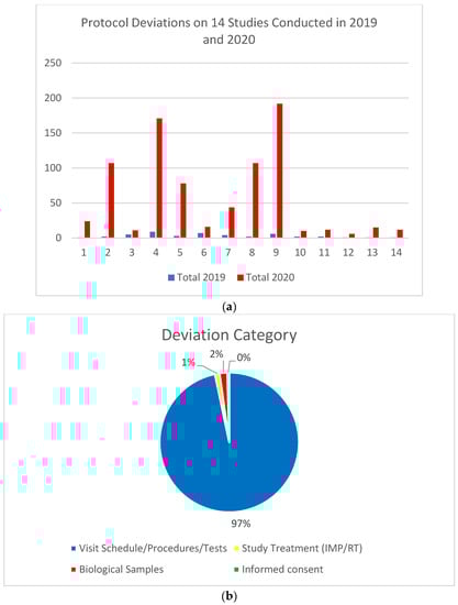(a) Paired assessment of protocol deviations of studies open to accrual in 2019 and 2020; (b) categories of protocol deviations observed.