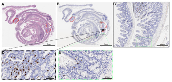 Analysis of ieMMCs in murine colon rolls. (A) Intestinal lesions were graded and annotated (red line) in an H.E. section; (B) Accordingly, a serial section of MCPT1 IHC was annotated; (C) Hotspots of MCPT1+ mast cells (MCs) were identified in neoplastic mucosa (black frame) and normal mucosa (green frame); (D) Mast cell numbers were counted in one 40× field (high-power field, hpf) of the respective hotspot. A semiquantitative score was applied (Figure S4) (Table 1); (E) In the adjacent normal mucosa, MC numbers were counted and scored accordingly.